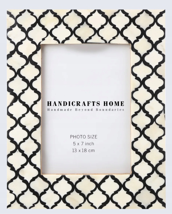 Ręcznie wykonane ramki na zdjęcia i zdjęcia inspirowane marokańskim wzorem. Wykonana z kości, żywicy i drewna sosnowego MDF. Dostępne w kolorze białym z czarnym wzorem.